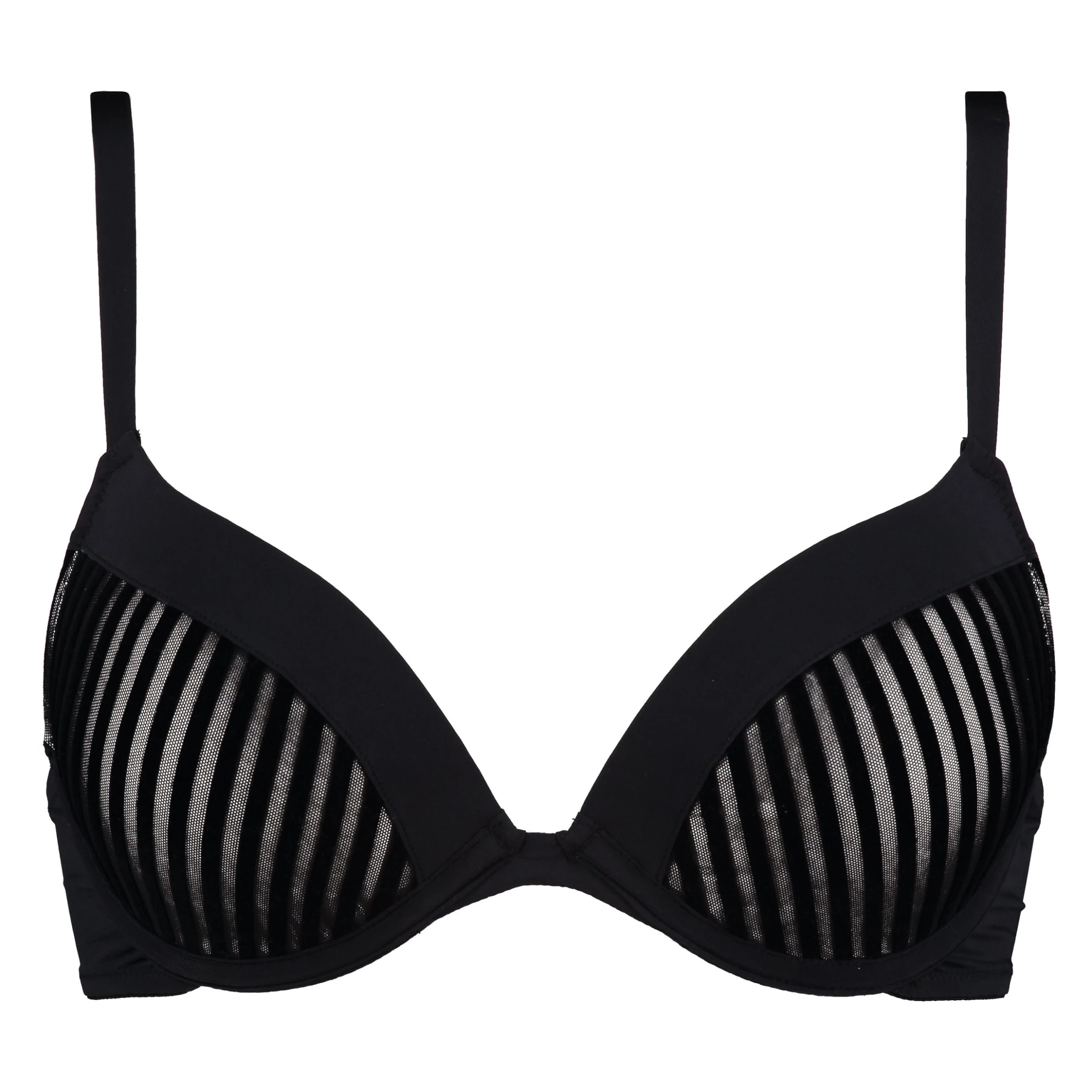 Dieser Push- up- BH ist am oberen Rand aus einem glatten Stoff. Auf den Cups befindet sich ein angenehmer gestreifter Mesh- Stoff mit Samt.